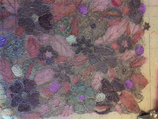 These are the pieces laid out on the sticky water soluble film. I did two samples. The first picture shows sample 1uncovered and the second shows sample 2 topped with a non sticky water sol film. I didn't leave a lot of space between motifs. The fabrics are all silk. Some are duppioni and others are organza in shades of dull purples and gray. The green is a shot organza in purple and green that doesn't read as green in person.